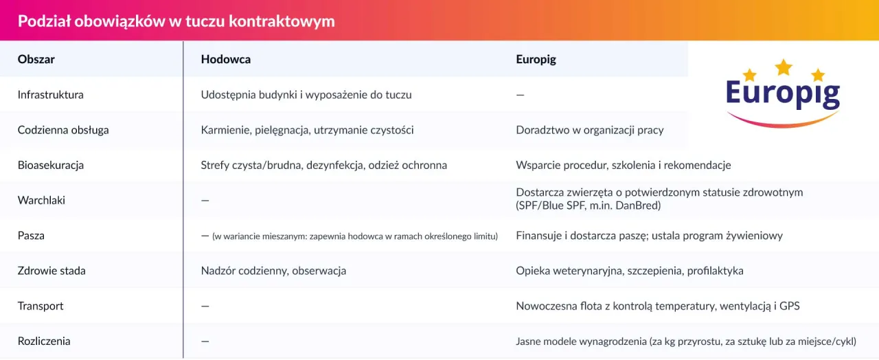 Takie podejście sprawia, że tucz kontraktowy staje się nie tylko sposobem na ograniczenie ryzyka, ale także narzędziem do rozwoju gospodarstwa. Europig pełni w tym procesie rolę partnera, który łączy wiedzę, doświadczenie i praktyczne wsparcie w codziennej hodowli.